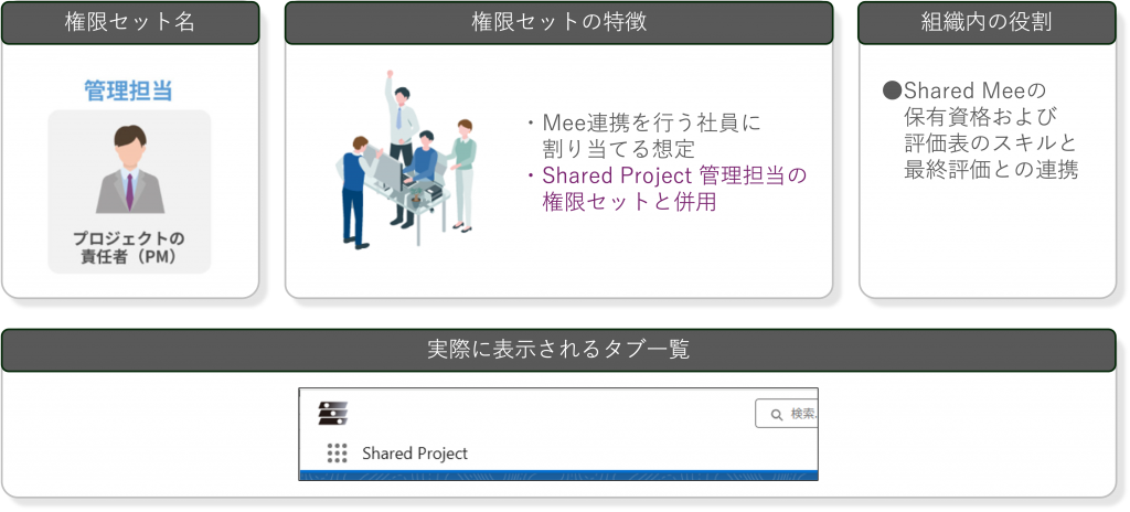 Shared Projectでは、用途に応じた3種類の標準権限セットに加え、Shared Meeと連携を行う際の権限セットをご用意しています。