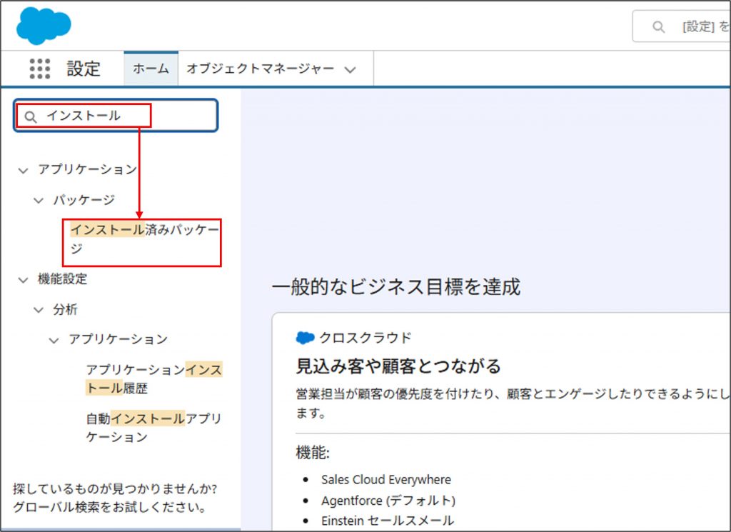 ②画面左側の検索窓で「インストール」と入力し、「インストール済みパッケージ」をクリックします。
