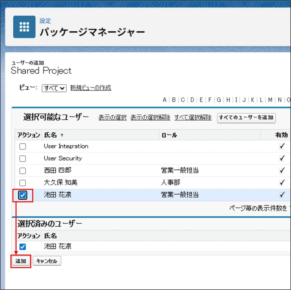 ⑤追加したいユーザーを選び「アクション」のチェックボックスにチェックを入れ「追加」をクリックします。