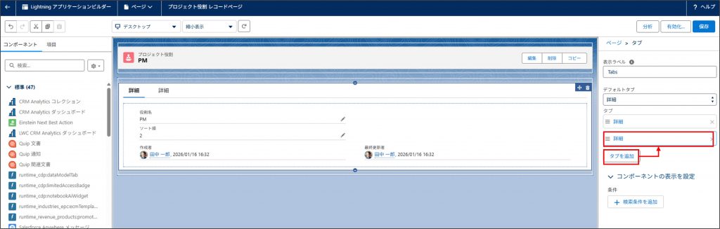 ⑤画面右側にある「タブを追加」を選択後、一番下に追加される詳細タブ名をクリックします。