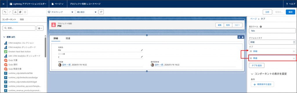 ⑦画面右側にある「関連」タブをドラッグアンドドロップで「詳細」タブの順番を入れ替えます。