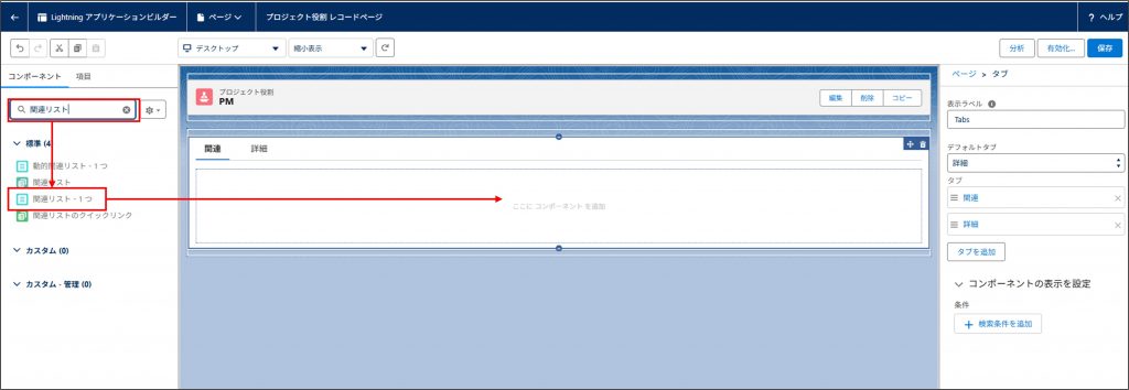 ⑧画面左側にあるコンポーネント検索欄で「関連リスト」を検索し、「関連リスト-1つ」をドラッグアンドドロップして、画面中央に配置します。