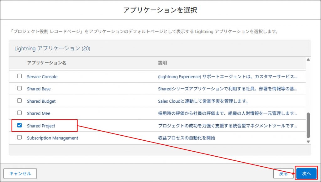 - 4.1.2.12 ⑫アプリケーション名のShared Projectにチェックを入れ、画面右下にある「次へ」をクリックします。