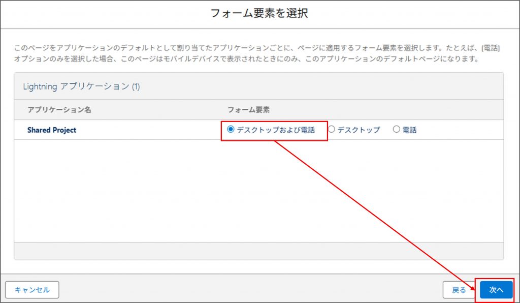 - 4.1.2.13 ⑬フォーム要素の「デスクトップおよび電話」を選択し、画面右下にある「次へ」をクリックします。
