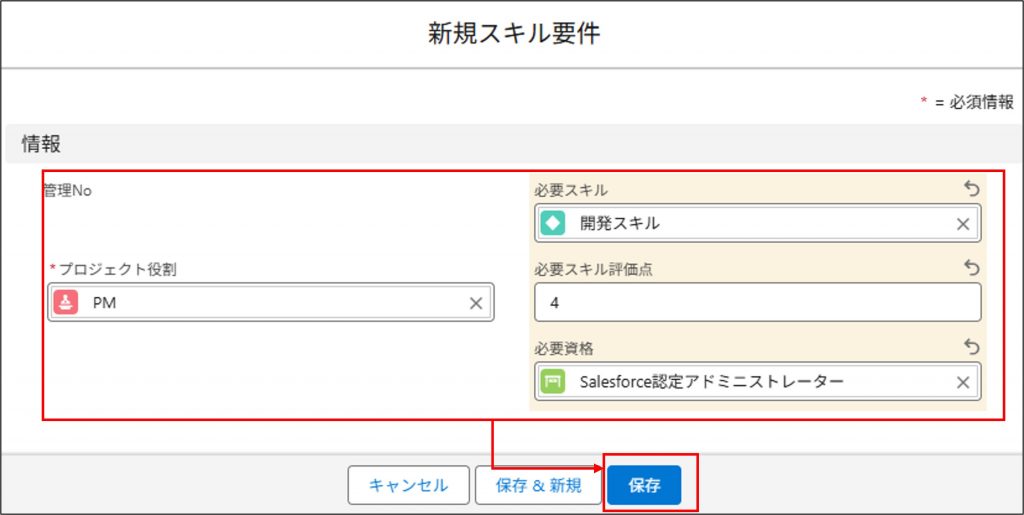 - 4.1.2.9 ⑨画面右側にある関連リストから「スキル要件」を選択し、右上の「保存」をクリックします。