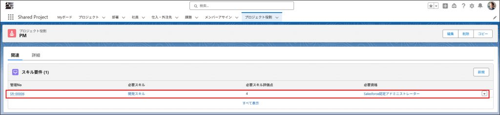 ④プロジェクト役割の関連画面にスキル要件が登録されます。