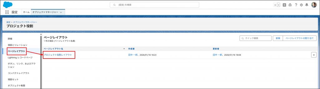 ③プロジェクト役割画面のページレイアウトを選択し、「プロジェクト役割レイアウト」をクリックします。