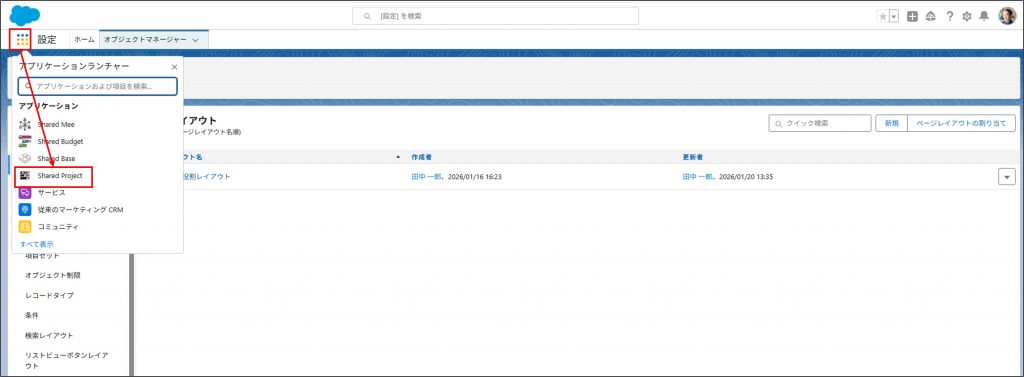 - 4.1.2.1 ①画面左上にあるアプリケーションランチャーから「Shared Project」をクリックします。